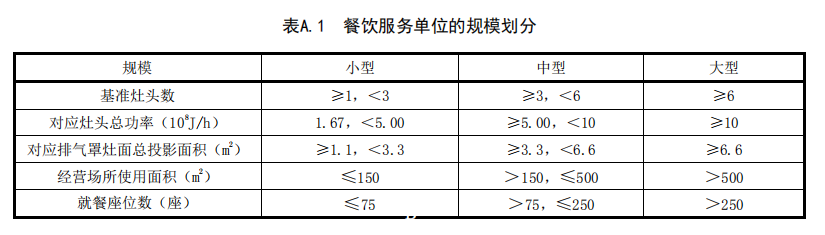 A.1 餐飲服務單位劃分為大型、中型和小型三個規模?;鶞试铑^數按灶的總發熱功率或排氣罩面投影